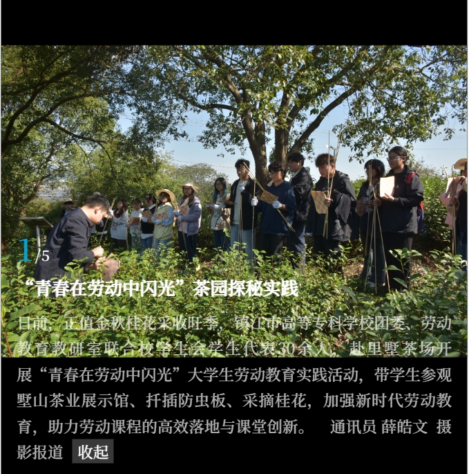 今日镇江|“青春在劳动中闪光”茶园探秘实践 信息来源:团委发布时间:25.10.31阅读次数:873 媒体链接:今日镇江:https://h5.jrzjapp.cn/davmu/mobile.html?url=https://h5.jrzjapp.cn/davmu/share/holly/gallery/2025/10/Rmm9YCmWv/index.html
