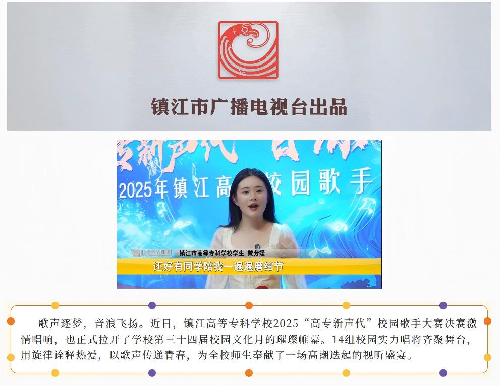 镇江广播电视台|歌声燃校园 新声启华章 江高专“新声代”决赛暨校园文化月启幕 信息来源:团委发布时间:25.11.04阅读次数:755 媒体链接:镇江广播电视台:https://zjwg.17zhenjiang.com/h5appzj/a/2511/647513a8904a41938da360c25cb66053.html?isshare=1