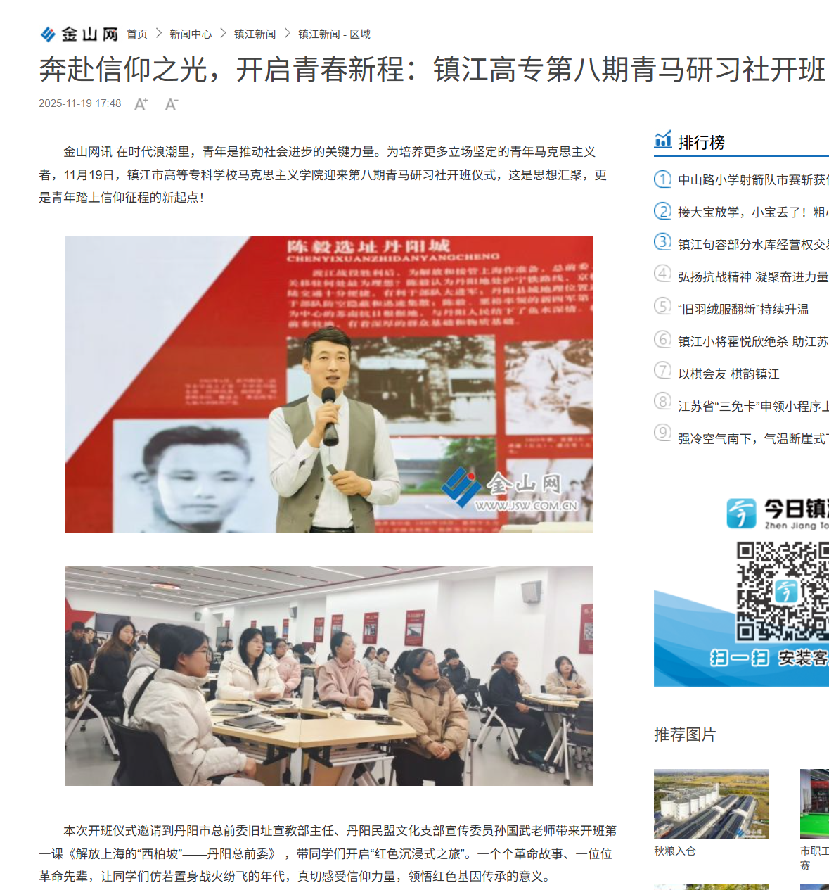 金山网|奔赴信仰之光,开启青春新程:镇江高专第八期青马研习社开班 信息来源:马克思主义学院发布时间:25.11.20阅读次数:606 媒体链接:金山网:https://www.jsw.com.cn/2025/1119/1932726.shtml