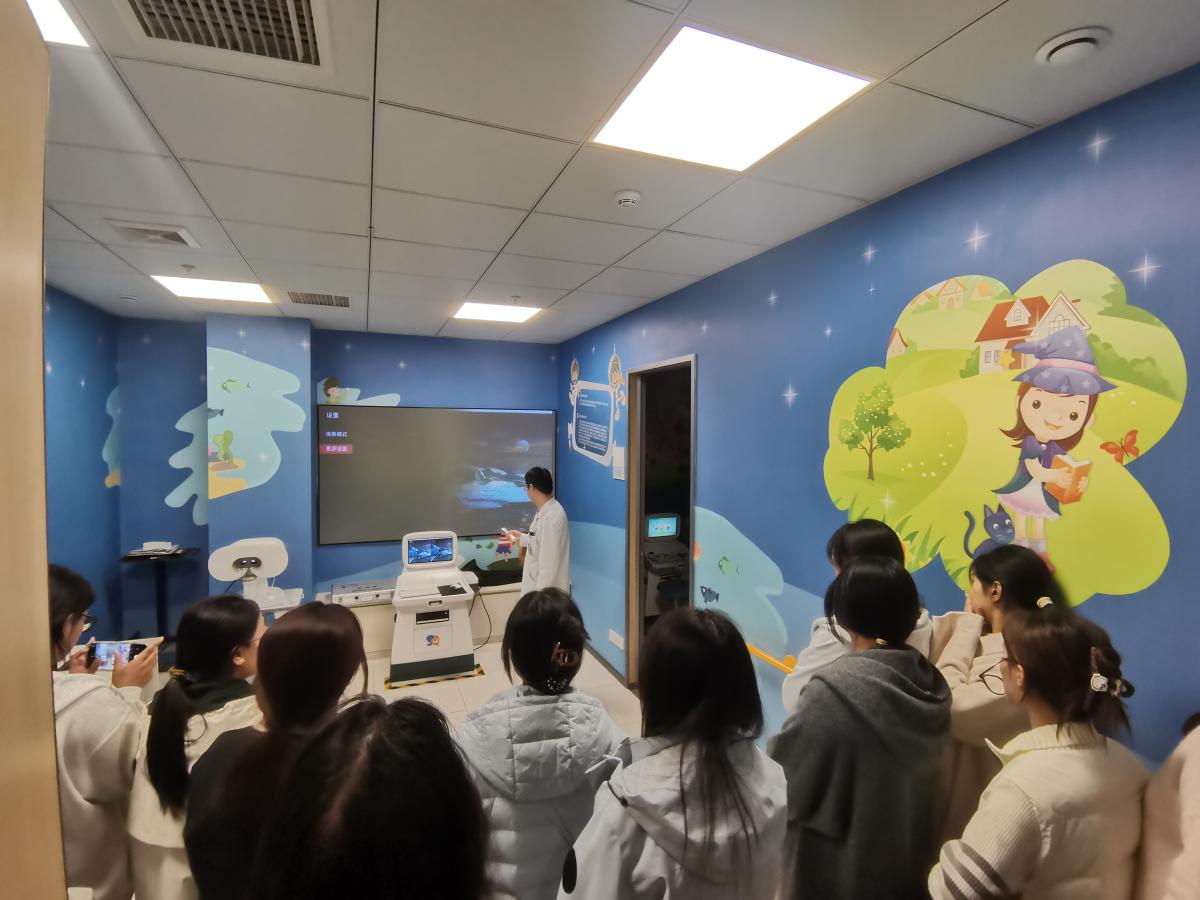 视康25级全体学生分组参观了角膜屈光科、儿童眼健康诊疗、视觉训练、斜视与小儿眼科等多个科室。同学们首先走进角膜屈光科,近距离观摩了屈光不正矫正诊疗的全流程,现场观摩了角膜屈光诊疗的核心要点与操作规范,在真实的诊疗场景中直观感受了角膜屈光技术的精准性与专业性。在斜视与小儿眼科的参观学习中,同学们深入儿童眼健康诊疗的专属场景,细致学习了斜视筛查、屈光检查、视功能评估等核心诊疗环节,近距离观察医护人员与患儿的沟通技巧、耐心细致的检查过程,以及针对儿童群体的个性化诊疗策略。