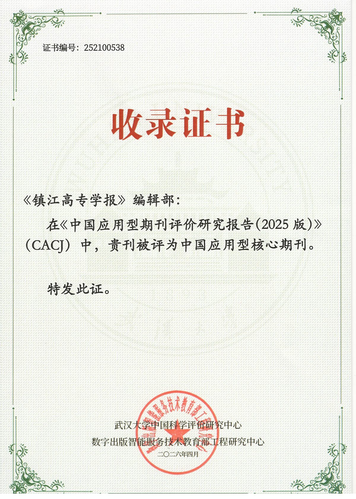 2026年4月10日,由武汉大学中国科学评价研究中心、数字出版智能服务技术教育部工程研究中心联合开展的2025版应用型期刊评价工作顺利完成,《中国应用型期刊评价研究报告(2025版)》正式发布,《镇江高专学报》再次入选中国应用型核心期刊。
