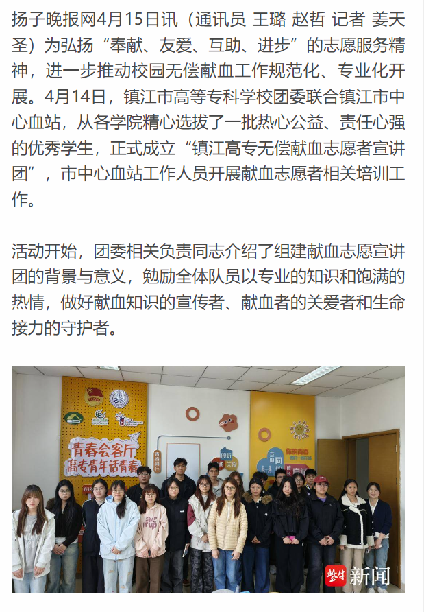 紫牛新闻|镇江高专成立无偿献血志愿者宣讲团,校地携手推进献血公益 信息来源:团委发布时间:26.04.17阅读次数:4839 媒体链接:紫牛新闻:https://wap.yzwb.net/wap/news/4956491.html?timestamp=1776385718268