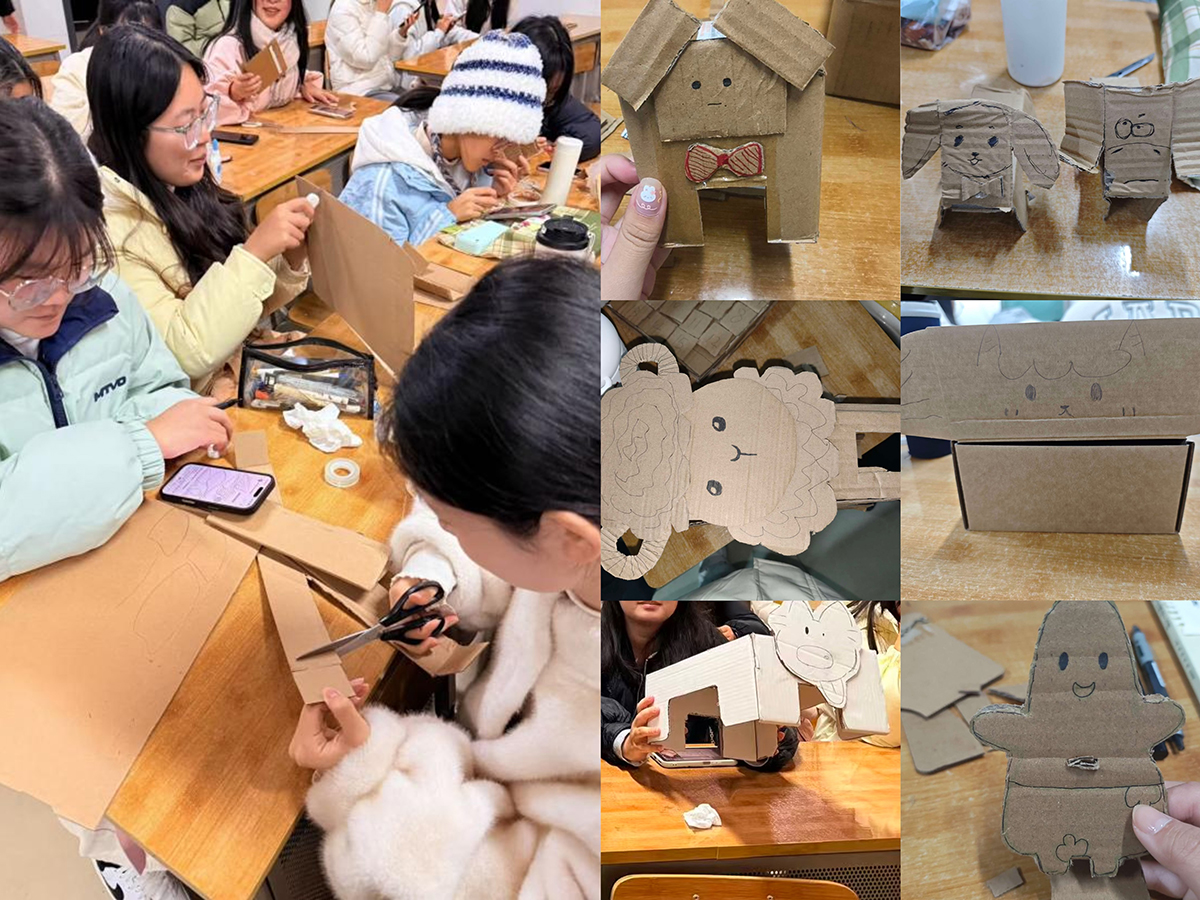 为深入践行绿色环保理念,丰富校园文化生活,激发学生的创新思维与实践能力,12月3日,学院开展“盒你一起,点亮生活”主题创意改造活动。鼓励同学们以日常闲置的纸盒、包装等材料为主要原料,通过创意设计与动手制作,赋予废弃物新的生命与价值,在实践中传递环保意识,诠释创意之美。 同学们围绕主题,充分发挥想象力与创造力,将平日里常见的快递盒、零食包装、旧纸箱等材料,巧妙转化为一件件兼具实用性与艺术感的作