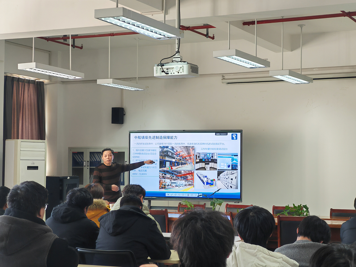 2025-12-08为深化产教融合,助力人才培养与行业需求精准对接,近日,现代装备制造学院特邀镇江市产业导师、学院产业教授、中船动力镇江有限公司高级工程师廖新山来校为60多名师生带来了一场题为“船舶动力发展及先进制造技术应用”的专题讲座。会议由学院党总支书记许学军主持。本次活动也是学院学术活动月活动之一。 讲座伊始,廖新山工程师以船舶动力系统的发展脉络为主线,从传统蒸汽机切入,梳理了内燃机从19世纪末汽油机型到
